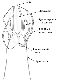 Значительная часть объёма тела гребневиков занята мезоглеей, несущей опорную функцию. Мезоглея представляет собой упругий гель, на 99 % состоящий из воды[7] и содержащий разнообразные клетки и коллаген. Рот ведёт в пищеварительную систему, называемую целентероном. Она начинается большой, уплощённой в одной плоскости глоткой (фаринксом), которая открывается в короткий канал, дающий начало дополнительным каналам, которые поставляют питательные вещества к гребным рядам, щупальцевым влагалищам и другим внутренним органам[4]. Мышечные и нервные клетки располагаются и в мезоглее, и в эпидермисе[8].