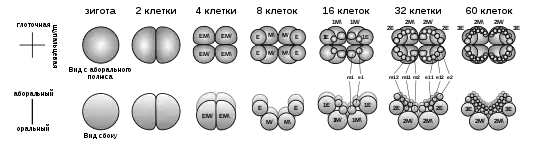 Яйца оплодотворяются в морской воде. В зиготах желток сконцентрирован в центре, а по периферии клетки находится цитоплазма с меньшим количеством желтка и ядро. Зигота претерпевает детерминированное дробление, то есть судьба каждого бластомера определяется ещё на самых ранних этапах дробления. Точка, в которой начинает формироваться первая борозда, соответствует оральному полюсу. Две первые взаимно перпендикулярные борозды дробления соответствуют будущим глоточной и щупальцевой плоскостям. Такое двулучевое дробление уникально для животного мира. В результате дальнейшего деления на оральном полюсе оказываются несколько макромеров, а на аборальном полюсе — многочисленные мелкие микромеры. Гаструляция идёт по типу эпиболии: аборальные микромеры перемещаются в сторону орального полюса, где погружаются в эмбрион путём инвагинации. Из них впоследствии развивается эпидермис, глотка, щупальцевые влагалища и гонады, то есть они имеют эктодермальное происхождение. Из макромеров отделяются микромеры орального полюса, которые представляют собой мезодерму. Они попадают в бластоцель через первичную кишку и дают начало миоцитам и другим клеткам мезодермы. После отделения оральных микромеров макромеры формируют энтодермальные каналы целентерона[35][33]. Главную роль в развитии и поддержании интерстициальных клеток играют гены семейства Sox[36].
