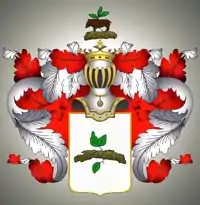 На серебряном поле горизонтально изображен пень с листьями, два вверху и один внизу.
