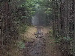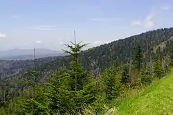 Этот тип хвойного леса (англ. spruce-fir forest) встречается лишь в верхней части гор на высоте 1520—1830 м (5000—6000 футов) над уровнем моря[42]. Местный относительно прохладный климат сравним с таковым в американском штате Мэн и канадской провинции Квебек — по этой причине растительность отражает более северный, бореальный характер. Другие особенности этого леса — часто тонкий, но богатый гумусом слой почвы и ещё большее, в сравнении с другими экосистемами, количество осадков. Ключевые древесные породы — ель красная и пихта Фразера (Abies fraseri), однако соотношение между ними неоднородно: если на нижней границе леса пихта Фразера встречается лишь эпизодически, то на верхней занимает около 75 % всего верхнего яруса. По этой причине ряд авторов выделяют особый подтип леса, растущий на самых высоких вершинах свыше 1800 м, — пихтовый лес (англ. fraser fir forest). В верхнем ярусе леса можно встретить также берёзы бумажную и аллеганскую, клён колосистый, черёмуху пенсильванскую (Prunus pensylvanica) и рябину Sorbus americana[43][44].