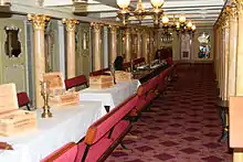 Под кормовым салоном находился главный или обеденный зал 30 × 9,1 м² (100 × 30 фут²) на 360 человек. С каждой стороны салона по семь коридоров выходили к четырём каютам каждый — всего 56 спальных мест. Передний конец салона был соединен с камбузом стюардов, в то время как на противоположном конце было установлено несколько рядов диванов. Этот салон был, по-видимому, самым помпезным из всех пассажирских помещений корабля. 24 бело-золотые колонны с «декоративными капителями величайшей красоты», были расположены по всей длине салона и вдоль стен, а восемь украшенных арабесками пилястр усиливали эстетический эффект. Арки дверей были украшены резьбой, позолочены и увенчаны круглыми барельефами. Зеркала на стенах создавали иллюзию простора, а сами стены были окрашены в «нежный лимонный оттенок» с голубыми и золотыми пятнами[37].