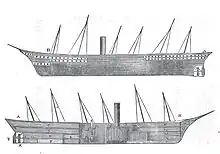 Корпус и единственная труба в середине корабля были окрашены в чёрный цвет с одной белой полосой вдоль корпуса, подчеркивающей ряд фальшивых орудийных портов. Корпус имел плоское дно без фальшкиля и с низкими выпуклостями по бокам в средней части судна, которые продолжались к корме — результат позднего решения о применении силовой установки с гребным винтом, которая была шире в основании, чем первоначально запланированная машина с гребными колёсами[24].