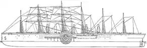 | Движитель | 2 боковых колеса диаметром 17 м, 1 винт с 4 лопастями, 6 мачт с общей площадью парусов 1 686 м² |
