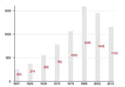 | 1897[4] | 1926[5] | 1939[6] | 1959[7] | 1970[8] | 1979[9] | 1989[10] | 2002[11] | 2010[1][2] |
