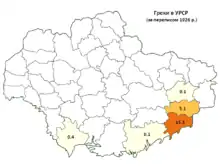 По переписи 2001 года на Украине имелось 91 500 греков, большинство [1], из них 77,5 в Приазовье, Донецкая область (руме и урумы). Уменьшение по сравнению с предыдущей переписью (160 000 греков) объясняется принудительной ассимиляцией советским правительством. Значительные очаги греков на Украине также сконцентрированы вокруг городов Одесса, Харьков, Житомир, Нежин, Львов.
