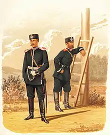 - Илл. 10. Инженерные войска. Обер-Офицер Гренадерского Саперного Е..И.В. Кн. Петра Николаевича батальона ( в парадной строевой форме ) и Унтер-Офицер 1-го Военно-Телеграфного парка ( в парадной и обыкновенной форме, вне строя ) ( прик. по воен. вед. 1881 г. № 313 ) // Иллюстрированное описание перемен в обмундировании и снаряжении войск Императорской Российской армии за 1881–1900 гг.: в 3 т.: в 21 вып.: 187 рис. / Сост. в Техн. ком. Гл. интендантского упр. — СПб.: Картографическое заведение А.Ильина, 1881–1900.