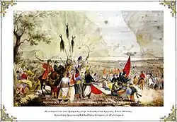 24 февраля Ипсиланти обратился к соотечественникам с воззванием, которое начиналось словами «Сражаюсь за Веру и Отечество»[8]:А-387. 26 февраля, в храме Святой Троицы в Яссах, было освящено знамя восстания"[8]:А-390.