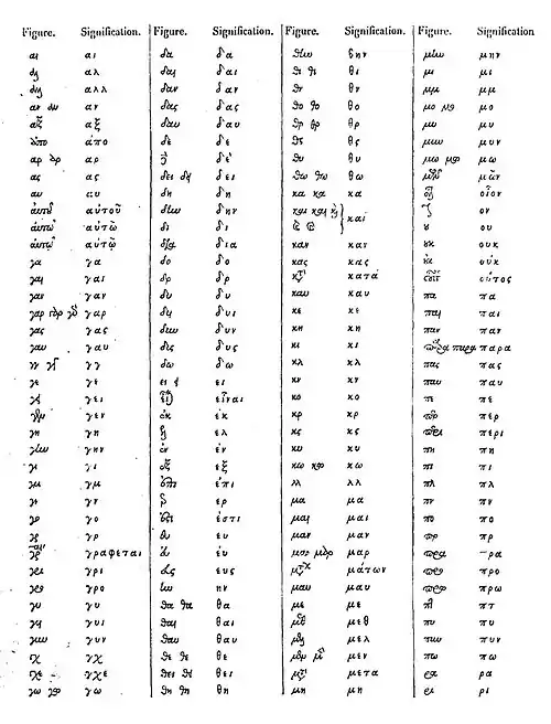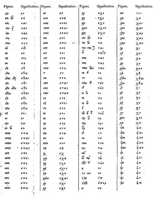 В классическом общегреческом алфавите было 27 букв, знаки Ϟ, ϟ (коппа) и Ϡ, ϡ (сампи) использовались лишь для записи чисел и впоследствии вышли из употребления. Для записи числа 6 использовалась дигамма Ϝ, ϝ, одно из начертаний которой внешне похоже на распространившуюся в византийскую эпоху лигатуру Ϛ, ϛ (ϲτ — стигма), поэтому распространилось заблуждение, что для записи числа 6 использовалась стигма.[1] Вышли из употребления также знаки архаического греческого алфавита Ͱ, ͱ (хета), Ϻ, ϻ (сан). Новогреческий алфавит имеет 24 буквы.