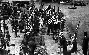 Первым к волнолому порта ошвартовался кормой эсминец «Леон», на котором находился штаб дивизии. Затем к баржам набережной ошвартовался пассажирский пароход «Патрис» (Πατρίς — Отечество), на котором находились 10-й и 20-й батальоны 1/38 полка эвзонов (соединения эвзонов имели свою отдельную и общевосковую нумерацию). 3/38 батальон 1/38 полка эвзонов находился на транспорте «Атрόмитос» (Ατρόμητος — Бесстрашный). Задачей этого батальона было высадиться на причале «карантина» и окружить здание губернского правления и турецкий квартал на юге города. Однако из-за ошибки, которая имела серьёзные последствия, транспорт вошёл в центральную гавань. Высадка началась в 8:00. Море людей с цветами и греческими знамёнами заполнило набережную. Жители города со слезами на глазах и крестясь встречали свою «Великую Пасху». Полковник Д. Ставрианопулосу сумел поубавить пыл масс. 2/38 батальону эвзонов майора К. Дзавеласа удалось сформировать колонну и среди ликующего населения начать марш к губернскому правлению. Майор Дзавелас игнорировал предупреждение своего проводника смирниота о том, что турки могут открыть огонь. Когда авангард батальона подошёл к губернскому правлению, он подвергся обстрелу из здания правления, гостиницы, близлежащих домов турецкого квартала, тюрьмы и штаба жандармерии[3]:155.