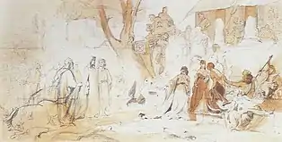 В 1870 году Генрих Семирадский закончил свою учёбу в Академии художеств в Санкт-Петербурге, получив звание классного художника первой степени, а также большую золотую медаль, которая была присуждена ему за представленную на конкурс картину «Доверие Александра Македонского врачу Филиппу». Вместе с медалью художник получил право на шестилетнюю пенсионерскую поездку за границу на средства Академии художеств[11][12]. Семирадский начал своё путешествие в качестве пенсионера в августе 1871 года и, посетив по пути Краков[13], в сентябре того же года прибыл в Мюнхен. Там он провёл несколько месяцев, написав за это время картину «Римская оргия блестящих времён цезаризма», получившую хорошие отзывы критиков, как в Мюнхене, так и в Петербурге, куда она была послана на очередную академическую выставку[14].
