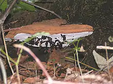Продырявленный снизу личинками грибных мушек гриб вида Ganoderma applanatum