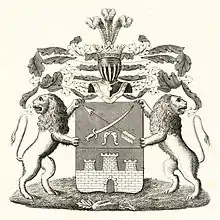 Щит увенчан дворянскими шлемом и короной. Нашлемник: три страусовых пера. Намёт на щите голубой и красный, подложенный серебром. Щитодержатели: два льва.