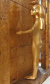 В западной стене находился незамурованный проход в сокровищницу. Здесь сохранились погребальные предметы высочайшего художественного уровня. Вход в неё, как предписано Книгой мёртвых, охраняли символы загробного мира: изваяния бога-шакала Анубиса на носилках, и голова коровы Мехурт (одна из ипостасей богини Хатхор). В центре комнаты бросался в глаза обитый золотом ковчег и четыре статуэтки богинь в охранных позах вокруг него. Статуэтки произвели самое большое впечатление на Картера среди всего, что он обнаружил в сокровищнице гробницы[78]. Осмотр показал, что и здесь побывали воры. Впрочем, на первый взгляд самые ценные предметы (статуи и малый золотой ковчег) не были повреждены. Картер распорядился временно закрыть сокровищницу деревянной дверью, чтобы она не отвлекала, и приступить к ней позже[75].