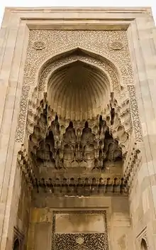 Отчетливо выделяясь на глади стен, объём портала с превосходными пропорциями прорезает линию карниза, выделяясь на фоне стрельчатого купола. Портал представляет собой глубокую прямоугольную нишу, завершенную стрельчатым полу-куполом с рубчатой поверхностью. Основание полу-купола покоится на четырёхъярусном поясе сталактитов. Архивольты арки покрыты стилизованным растительным орнаментом[16]. Над её замком расположены две арабоязычные надписи, выполненные почерком насх. Тимпаны портала заполнены орнаментом растительного характера. Ширина орнамента— 2 мм, а глубина его местами достигает 20 мм[17]. Прямоугольная ниша входа переходит четырьмя рядами сталактитов в стрельчатый полукупол. Внешняя и внутренняя арки сталактитового свода окаймлены жгутами.