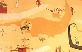 Стена с росписями - единственное доказательство существования гробницы — даёт богатую информацию. В росписи представлена процессия из пяти ладей, сцены охоты, изображения сражающихся воинов и танцующих женщин, домашние и дикие животные. Обращают внимание некоторые мотивы, популярные позже — в частности, правитель, побивающий пленных врагов, и «герой со львами» — укрощающий двух львов мужчина.