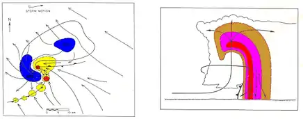 Нисходящие потоки в грозах возникают на высотах, где температура воздуха ниже, чем температура в окружающем пространстве, и этот поток становится ещё холоднее, когда в нём начинают таять ледяные частицы осадков и испаряться облачные капли. Воздух в нисходящем потоке не только более плотный, чем окружающий воздух, но и он несёт ещё горизонтальный момент количества движения, отличающийся от окружающего воздуха. Если нисходящий поток возникает, например, на высоте 10 км, то он достигнет поверхности земли с горизонтальной скоростью, заметно большей, чем скорость ветра у земли. У земли этот воздух выносится вперёд перед грозой со скоростью, большей, чем скорость движения всего облака. Именно поэтому наблюдатель на земле ощутит приближение грозы по потоку холодного воздуха ещё до того, как грозовое облако окажется у него над головой. Распространяющийся по земле нисходящий поток образует зону глубиной от 500 метров до 2 км с отчётливым различием между холодным воздухом потока и тёплым влажным воздухом, из которого формируется гроза. Прохождение такого шквального фронта легко определяется по усилению ветра и внезапному падению температуры. За пять минут температура воздуха может понизиться на 5 °C или больше. Шквал образует характерный шквальный ворот с горизонтальной осью, резким падением температуры и изменением направления ветра.