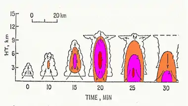 Формирование облачности начинается с возникновения кучевого облака хорошей погоды (Cumulus humilis). При благоприятных условиях возникшие кучевые облака быстро растут как в вертикальном, так и в горизонтальном направлении, при этом восходящие потоки находятся почти по всему объёму облака и увеличиваются от 5 м/с до 15-20 м/с. Нисходящие потоки очень слабы. Окружающий воздух активно проникает внутрь облака за счёт смешения на границе и вершине облака. Облако переходит в стадию средних кучевых (Cumulus mediocris). Образующиеся в результате конденсации мельчайшие водяные капли в таком облаке сливаются в более крупные, которые уносятся мощными восходящими потоками вверх. Облако ещё однородное, состоит из капель воды, удерживаемых восходящим потоком, — осадки не выпадают. В верхней части облака при попадании частиц воды в зону отрицательных температур капли постепенно начинают превращаться в кристаллы льда. Облако переходит в стадию мощного кучевого облака (Cumulus congestus). Смешанный состав облака приводит к укрупнению облачных элементов и созданию условий для выпадения осадков и образования грозовых разрядов. Такое облако называют кучево-дождевым (Cumulonimbus) или (в частном случае) кучево-дождевым лысым (Cumulonimbus calvus). Вертикальные потоки в нём достигают 25 м/с, а уровень вершины достигает высоты 7—8 км.