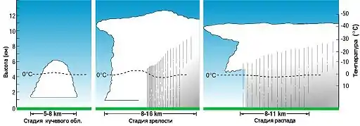 Все грозовые облака, независимо от их типа, последовательно проходят 3 стадии: