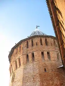 Многогранная четырёхъярусная башня. В настоящее время восстановлена в первоначальном виде. Сводчатые межэтажные перекрытия достроены позже.