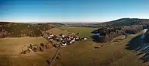 Располагается между холмами Шмориц (Schmoritz, Žmórc, 412, 4 м.) и Дёленер-Берг (Döhlener Berg, Hromadnik,514 м.) юго-восточнее Баутцена.