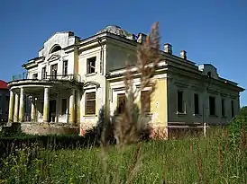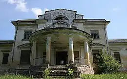 Здание усадьбы представляет собой небольшой двухэтажный дворец с куполом (со шпилем), колоннами, парадной лестницей и открытой террасой с видом на парк[1]. К двухэтажному строению примыкают два одноэтажных крыла. Также к двухэтажному строению примыкает полуциркулярная двухэтажная веранда.