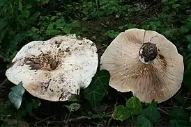 Цвет шляпки белый или с розовыми и сиреневыми зонами, часто концентрическими. Пластинки поначалу беловатые, потом они розовеют и под конец становятся светло-оранжевыми.