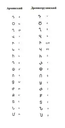 - Николай Марр в статье «Об единстве задач армяно-грузинской филологии» отмечал большое сходство древнего армянского алфавита и грузинского церковного письма (хуцури): «грузинское церковное письмо, единственно употреблявшееся в Грузии книжниками до X—XI в., действительно проявляет чрезвычайную близость к армянскому алфавиту»[28].