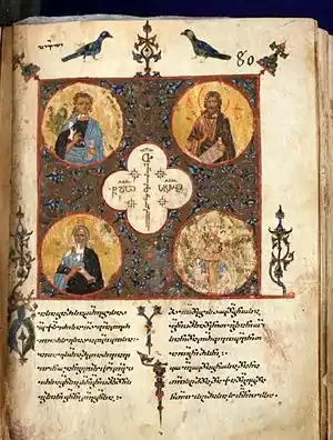 Древнейшая из грузинских азбук, обнаруженная в Верхней Сванетии на западной стене Ацской церкви Архангелов, содержит 37 букв и датируется XI веком. Самыми древними грузинскими надписями являются две из четырёх надписей, обнаруженных при раскопках древнегрузинского монастыря в Бир-эль-Кутте, в Палестине, и датируемых 429—444 гг., хотя не все учёные согласны со столь ранней датировкой. Надпись Болнисского Сиона является второй по древности (493—494 гг.)[50]. Сохранились около 10[51]—12 тыс.[52] средневековых грузинских рукописей.