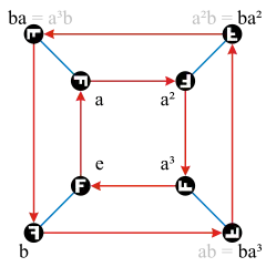 Заметим, что i, j и k имеют порядок 4 в Q и любые два из них порождают всю группу. Другое задание группы Q[4], показывающее это: