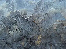 Обычно кристаллы снега (Снежинка или иней) имеют сложную 6-лучевую звёздную фигуру роста различной формы с гексагональной симметрией (Гексагональная сингония).