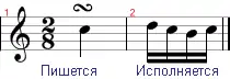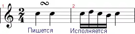 Если группетто находится между нотами, то исполняется за счёт длительности предыдущей ноты.