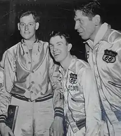 ![]() Роберт Грюниг (слева), Джимми Макнэтт (в центре) и Гордон Карпентер (справа) после завершения турнира AAU 1945 года, в котором «Филлипс 66» переиграла «Денвер Эмброуз» со счётом 47-46 | |||||||