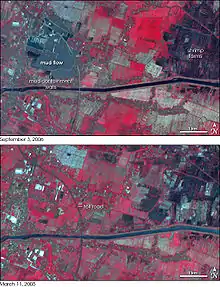 По состоянию на май 2008 года грязь растеклась по площади 6,5 км², заставив около 36 тысяч жителей из 12 близлежащих деревень покинуть свои дома[7].