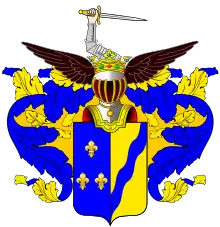 Щит увенчан обыкновенным дворянским Шлемом с дворянскою на нем Короною, на поверхности которой видна Рука с Мечом, а по сторонам Шлема распростёрты два Орлиные Крыла. Намёт на щите голубой, подбитый золотом.