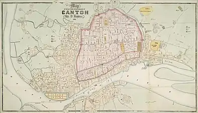 Карта «Города и всех пригородов Кантона», составленная Вруманом 1860 года, одна из первых, сделанных после Тяньцзиньского и Пекинского договоров разрешил иностранцам полный доступ в город-крепость Гуанчжоу