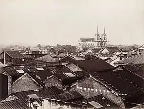 Собор Святого Сердца возвышается над одно- и двухэтажными домами старого Гуанчжоу, ок. 1880 г.
