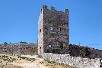 - Замок Чобан-Куле (Пастушья башня, тат. генуэзское название неизвестно), центр владений ди Гуаско. Сохранился до настоящего времени. Находится вблизи села Морское. Сейчас над вершиной горы на мысе Агира возвышается круглый донжон, была раскопаны стены и строения поселка[11][12]. Следов штурма османами нет, разрушен не был, вероятно использовался ими далее как сторожевой пост.