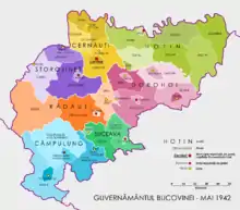 Губернаторство делилось на такие жудецы, как Дорохой (центр в Дорохой), Сучава (центр в Сучава), Кымпулунг (центр — Кымпулунг), Рэдэуци (центр — Рэдэуци), Хотинский (центр — Хотин), Сторожинец (центр в одноимённом городе) и Черновцы (центр в Черновцах). Каждый жудец дополнительно делился на пласы.