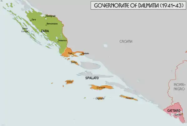 Губернаторство Далмация было создано из частей береговой Югославии, оккупированных и аннексированных Италией с апреля 1941 года по сентябрь 1943 года, и довоенной итальянской провинции Зара на побережье Далмации, в том числе острова Лагоста (Ластово). Город Зара (Задар), в котором проживало большинство итальянцев Далмации с начала XX века[2], стал административным центром образовавшегося губернаторства.