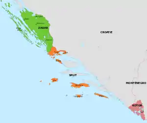 Губернаторство Далмация состояло из трёх провинций: Зара (Задар), Спалато (Сплит) и Каттаро (Котор). Административный центром губернаторства была Зара.