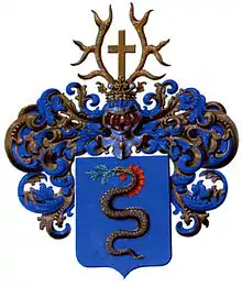 Над щитом дворянский шлем с короной. Нашлемник: между двух золотых оленьих рогов с пятью отростками каждый, золотой с длинным концом крест. Намёт: лазоревый с золотом.