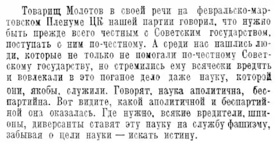 «Троцкистско-бухаринские мерзавцы пытались подорвать советскую науку, пытались поставить барьер между наукой и конкретными задачами социалистического строительства и кое в чём успели основательно напакостить. Железная рука пролетарского правосудия уничтожила этих фашистских агентов».