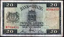 Государственное образование вольный город Данциг было создано в 1920 году. Поначалу его денежной единицей являлась немецкая марка, но гиперинфляция в Германии в начале 1920-х годов вынудила местные власти пойти на введение собственной валюты и изъятие немецких марок из денежного оборота. В сентябре 1923 года был образован Данцигский банк, который начал выпуск данцигских гульденов (равнявшихся 100 пфеннигам). Новая валюта была привязана не к марке, а к фунту стерлингов (25 данцигских гульденов = 1 фунт стерлингов)[83]. Были выпущены монеты номиналом 1, 2, 5 и 10 пфеннигов, а также в ½, 1, 2, 5, 10 и 25 гульденов; банкноты выпускались номиналом в 1, 2, 5, 10, 25 и 50 пфеннигов[84], а также 1, 2, 5, 10, 20, 25, 50, 100, 500 и 1000 гульденов[85].