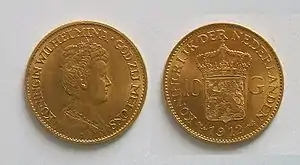 Очередное изменение в ценности денежной единицы произошло в 1875 году, когда страна перешла к золотомонетному стандарту. Содержание чистого золота в 1 гульдене законодательно устанавливалось в 0,6048 г. В Голландии стали чеканить золотые монеты номиналом в 10 и 5 гульденов[61].