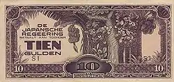 В 1942 году, после захвата голландских ост-индских владений Японией, оккупационной администрацией — как и на многих других занятых японцами территорий — были выпущены военные деньги с названием прежних местных денежных единиц: японские оккупационные гульдены. На аверсе новых банкнот печатались номинал и надпись «Японское правительство» на нидерландском и японском языках. В 1944 году в рамках усилий японской администрации по стимулированию националистических, антиевропейских настроений среди местного населения оккупационные гульдены были переименованы в рупии[64]. Оккупационные рупии имели хождение до окончания японского военного присутствия осенью 1945 года. После возвращения нидерландской колониальной администрации выпуск гульденов был возобновлён. Оккупационные деньги выкупались по курсу: 3 нидерландских гульдена Ост-Индии за 100 оккупационных гульденов и/или рупий[65]. Выпуск ост-индского гульдена продолжался до изгнания голландцев в результате войны за независимость Индонезии: в 1950 году денежной единицей страны стала индонезийская рупия[63].