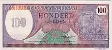 В Нидерландской Гвиане (Суринаме) местная денежная единица была приравнена к гульдену метрополии. В 1940 году, после оккупации Нидерландов войсками Третьего рейха, в колонии была установлена привязка валюты Суринама к доллару США. 1 доллар США обменивался на 1,886 суринамских гульдена. Официальный курс оставался относительно стабильным в течение нескольких десятилетий. В 1971 году был установлен курс в 1,78879 гульдена за $1[67]. В 1990-х годах бывшая голландская колония пережила сильные финансовые потрясения, которые привели к обесцениванию местной денежной единицы[68]. В 2004 году суринамский гульден прекратил своё существование в связи с введением суринамского доллара. Обменный курс составил 1000 гульденов за один доллар[69].