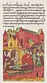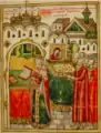 Миниатюра Лицевого летописного свода с надписью: «Той же зимой в декабре в 4 день, на память святой великомученицы Варвары и преподобного отца нашего Иоанна Дамаскина, скончался Гурий, архиепископ Казанский и Свияжский, и погребен был в Казани в монастыре Преображения Господа нашего Исуса Христа; этот Гурий был первым архиепископом в Казани, а на архиепископстве в Казани был…»