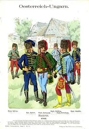 В 1751 году в Священной Римской Империи (в состав которой входила Венгрия) для гусар были введены единый устав нем. Regulanment und Ordun fuer gasammte k.k. Husaren Regimenter и единая униформа, включавшая ментик, доломан и гусарский головной убор (изначально из меха со свисающим с макушки куском ткани, впоследствии головной убор стал делаться из других материалов), взятая за образец другими странами и утвердившая классический образ гусара. Устав вводил регулярное денежное жалование и решал проблемы снабжения фуражом и продовольствием, предписывал обеспечение гусар жильём[11]. Также была запрещена игра в карты, и основным способом проведения свободного времени у гусар явились танцы[66]. Помимо прочего, была налажена служба полевых ветеринарных госпиталей нем. Field-Tier-Spaitaeler, немаловажная для сохранения боеспособности при длительных боевых действиях[73] (для сравнения: армия Наполеона, имевшая лишь одного ветеринара на 500 лошадей, во время затянувшихся военных кампаний несла жесточайшие потери конского состава, к примеру, в 1812 году кавалерия Мюрата из 22 000 верховых лошадей лишь за первый месяц кампании потеряла 10 000)[74].