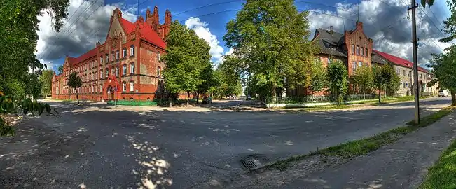 - Здание Гусевского агропромышленного колледжа, построенного в Неоготическом стиле. 54°35′15″ с. ш. 22°12′12″ в. д.