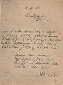 Стихотворение, написанное Гусейн-заде в апреле 1944 года в Италии, в городе Пула